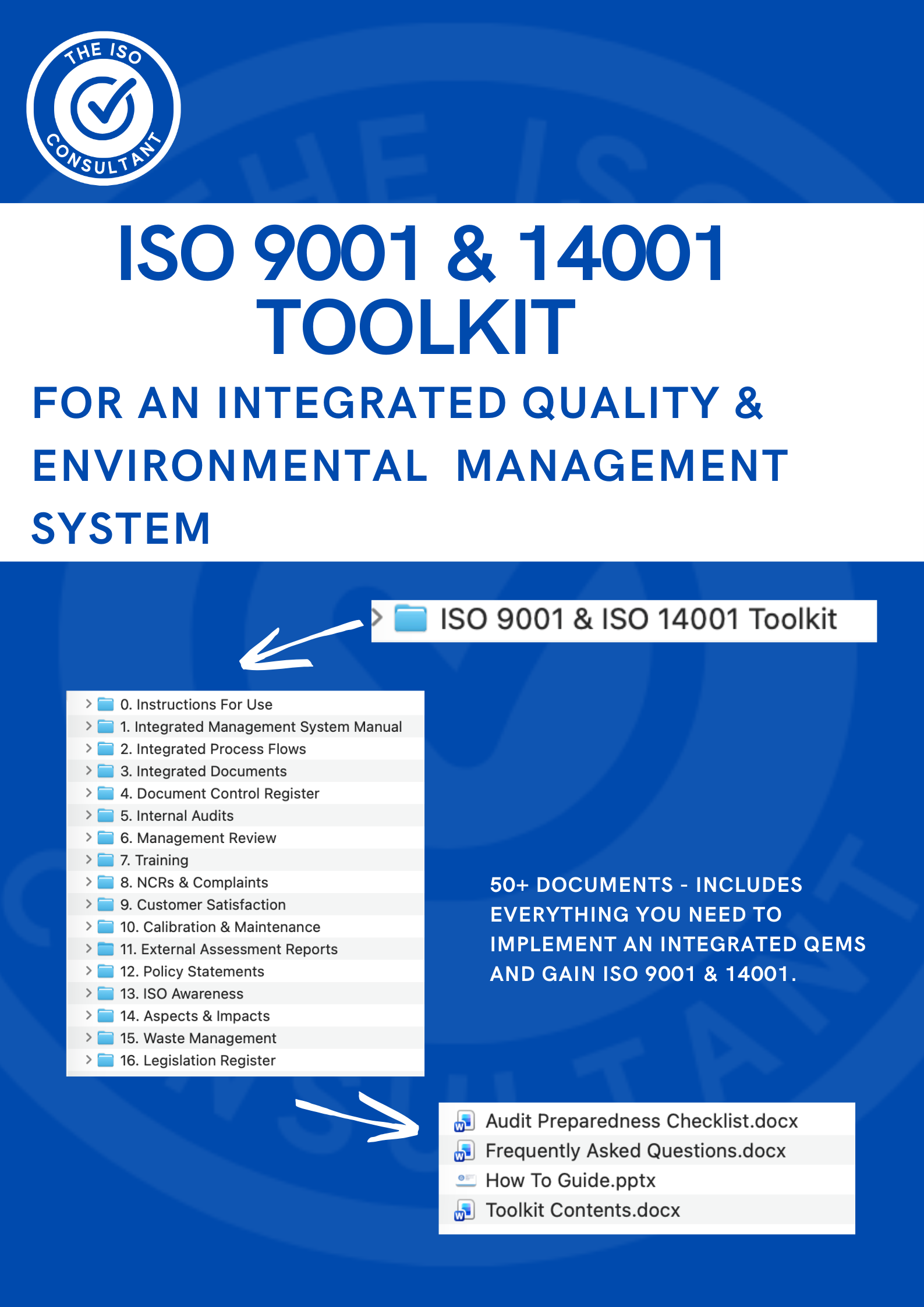 Our ISO 9001:2015 & ISO 14001:2015 Integrated Toolkit is a complete, downloadable solution designed for businesses that have the time to implement ISO themselves but need the tools to do it. Packed with professionally developed templates and guides, this toolkit helps you build a compliant Quality & Environmental Management System (QEMS) quickly and efficiently.